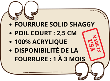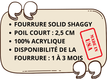 Toutes les options de fourrure présentées ci-dessous appartiennent à la catégorie "SHAGGY", ayant toutes des textures de poils similaires afin de pouvoir être harmonieusement associées entre elles.