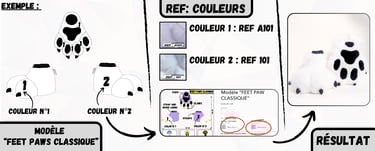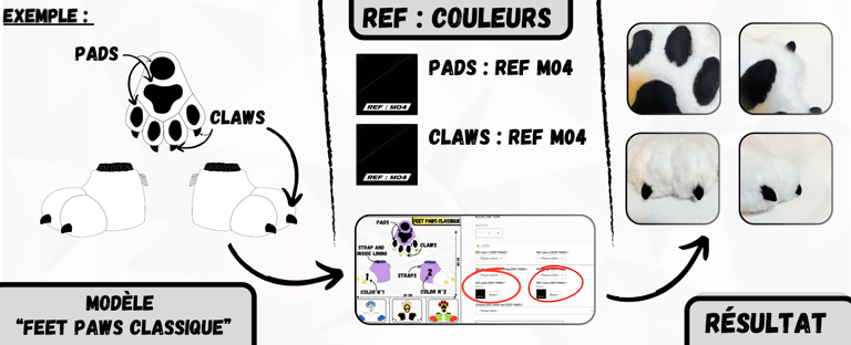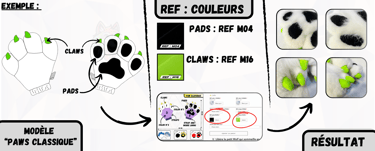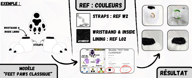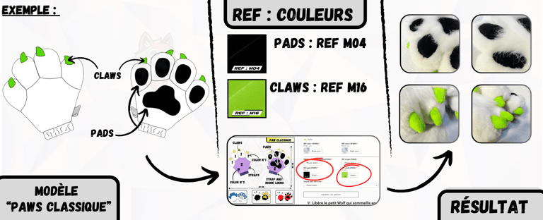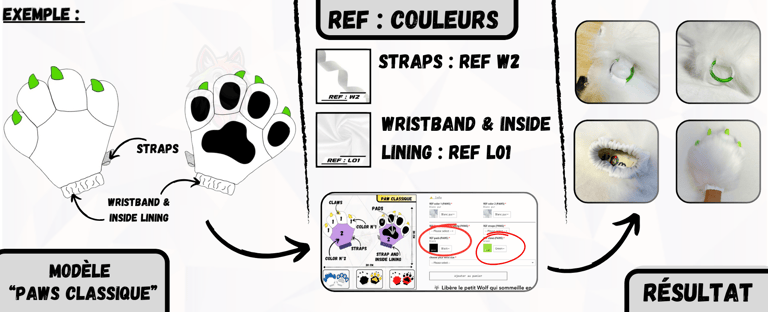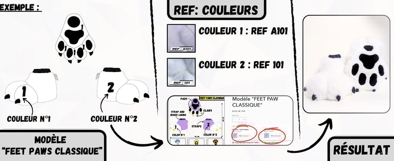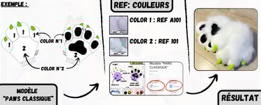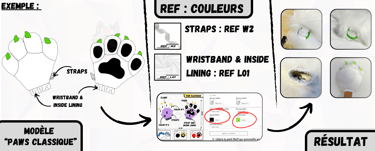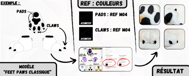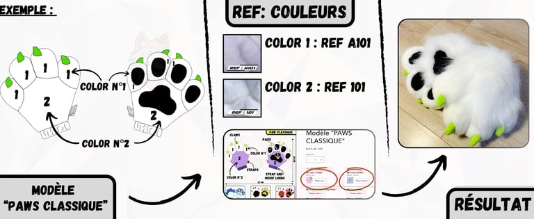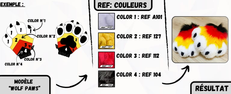 Après avoir sélectionné un modèle de Paws ou de Feet Paws à personnaliser sur notre boutique en ligne "wolf-studio.fr", il est temps de choisir tes couleurs de fourrures et de reporter les "REF:" correspondantes dans la fiche du produit que tu as choisi. Ces références permettront de personnaliser chaque détail de ta création.