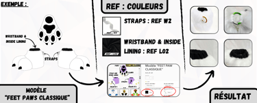 Une fois vos couleurs de fourrures, les Griffes ( CLAWS ) et les Coussinets ( PADS ) choisi et sélectionnées dans la fiche produit il vous faudra ensuite personnaliser le Bracelet et la doublure intérieur ( WRISTBAND & INSIDE LINING ) & la Sangle ( STRAPS ) de vos pattes en choisissant un coloris de tissus Lycra et une couleur de sangle en coton qui vous plait.