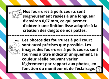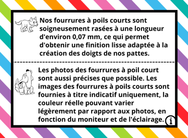 Ci-dessous, vous découvrirez une sélection de fourrures à poil long, pour le corps de la patte, et des fourrures à poil court, spécialement adaptées à la création des doigts.
